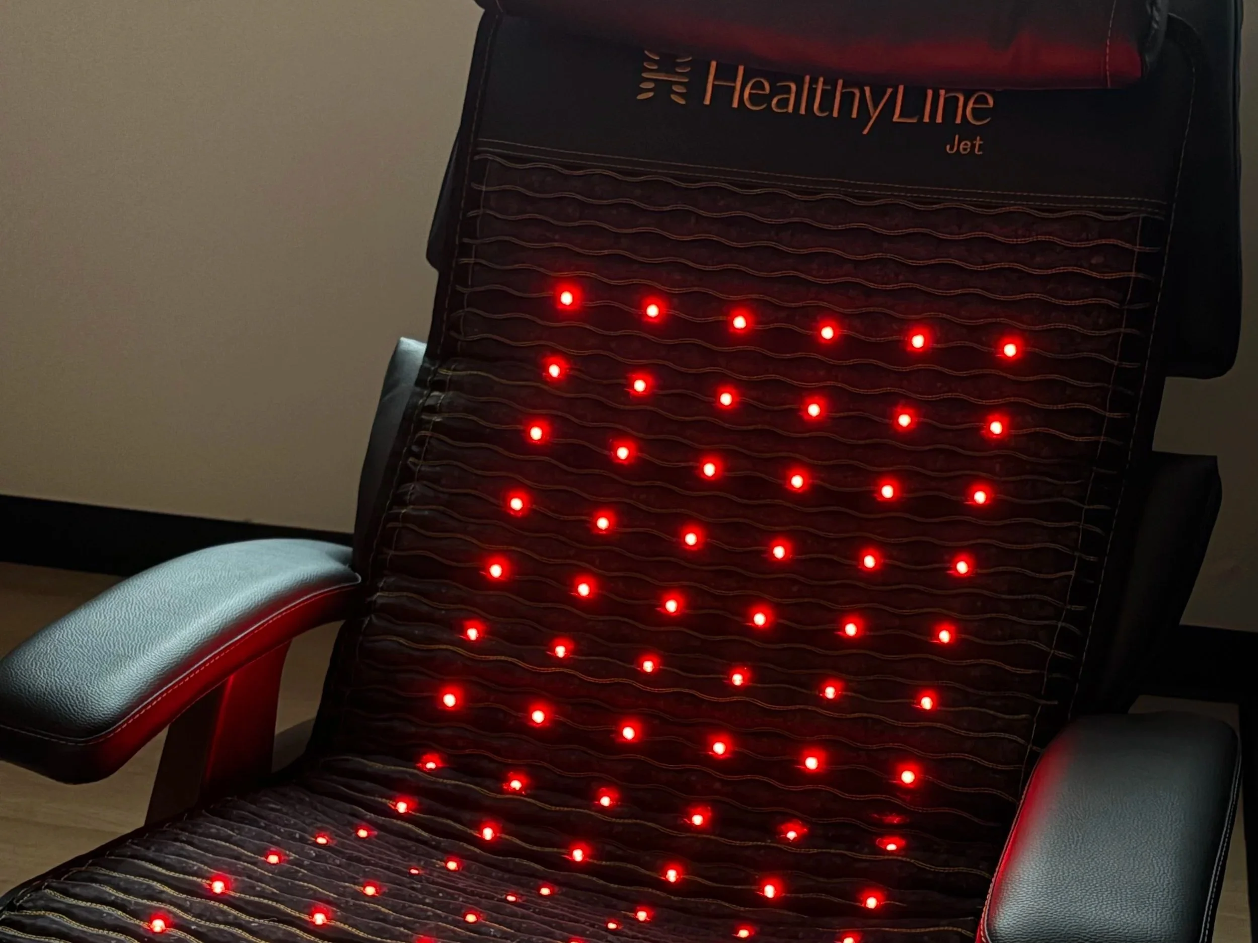 Recline in a zero-gravity chair on a HealthyLine crystal grounding PEMF mat with red light therapy, designed to support cellular health, circulation, and deep relaxation.